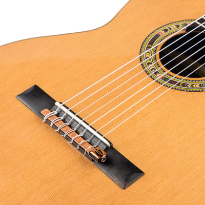 El NG-2 7S se instala de forma muy fácil y segura en el puente de la guitarra clásica o flamenca, bajo las cuerdas, utilizando la tensión de las mismas. No requiere hacer perforaciones, cortes ni daño a tu guitarra.
